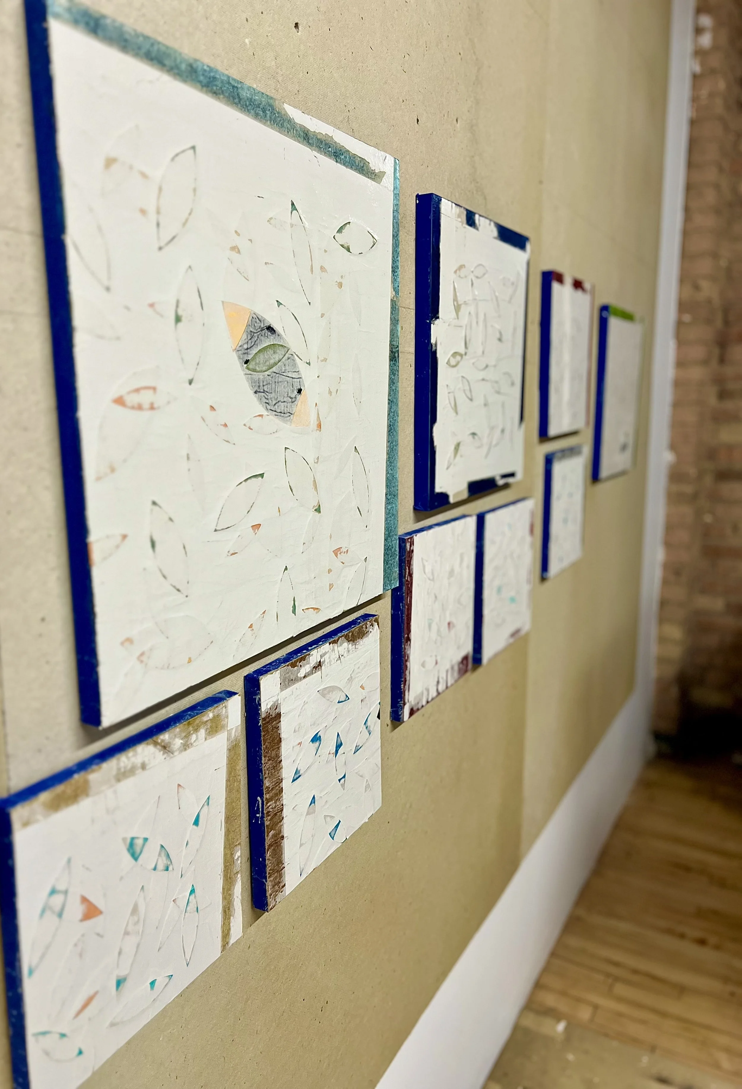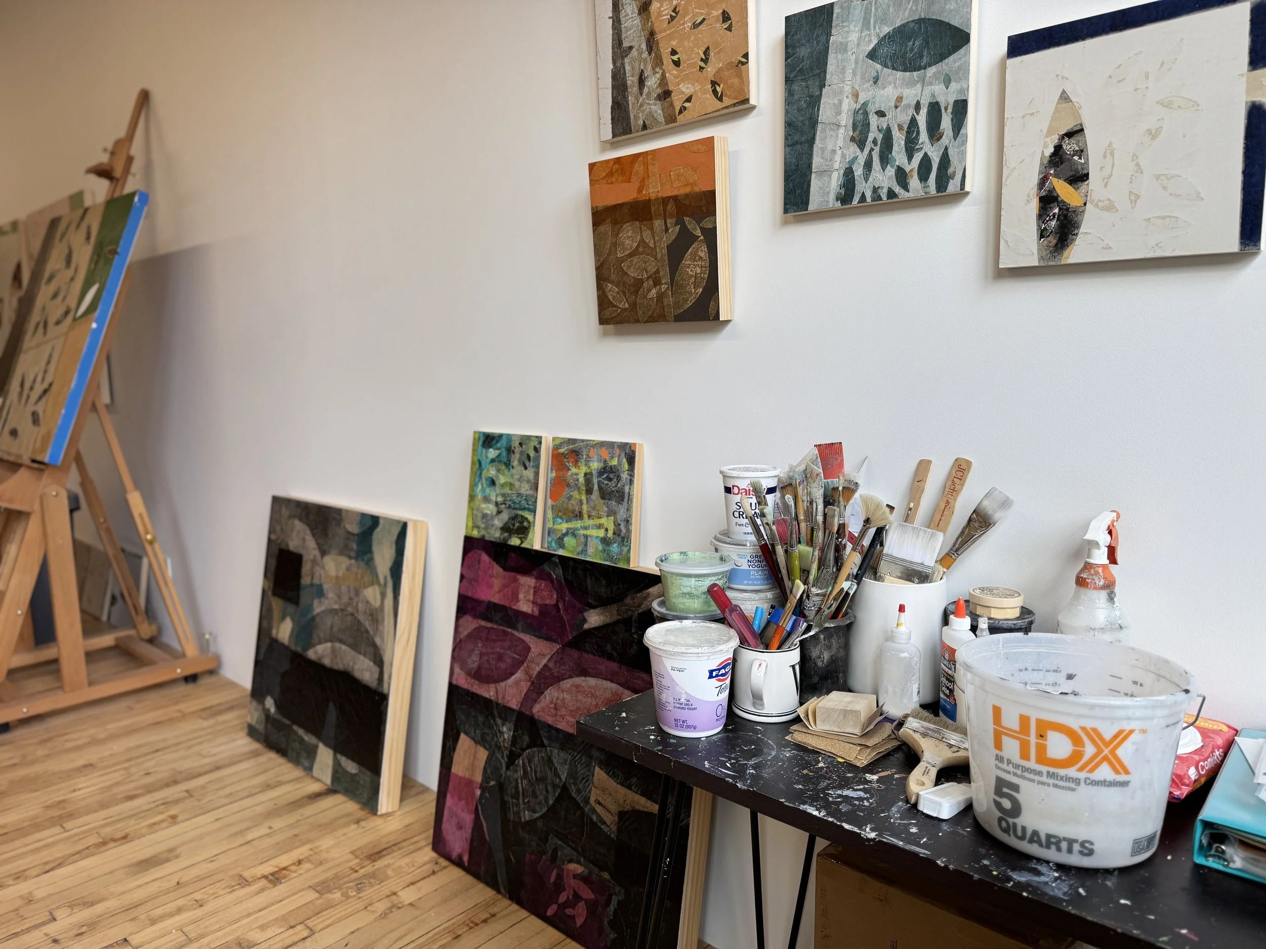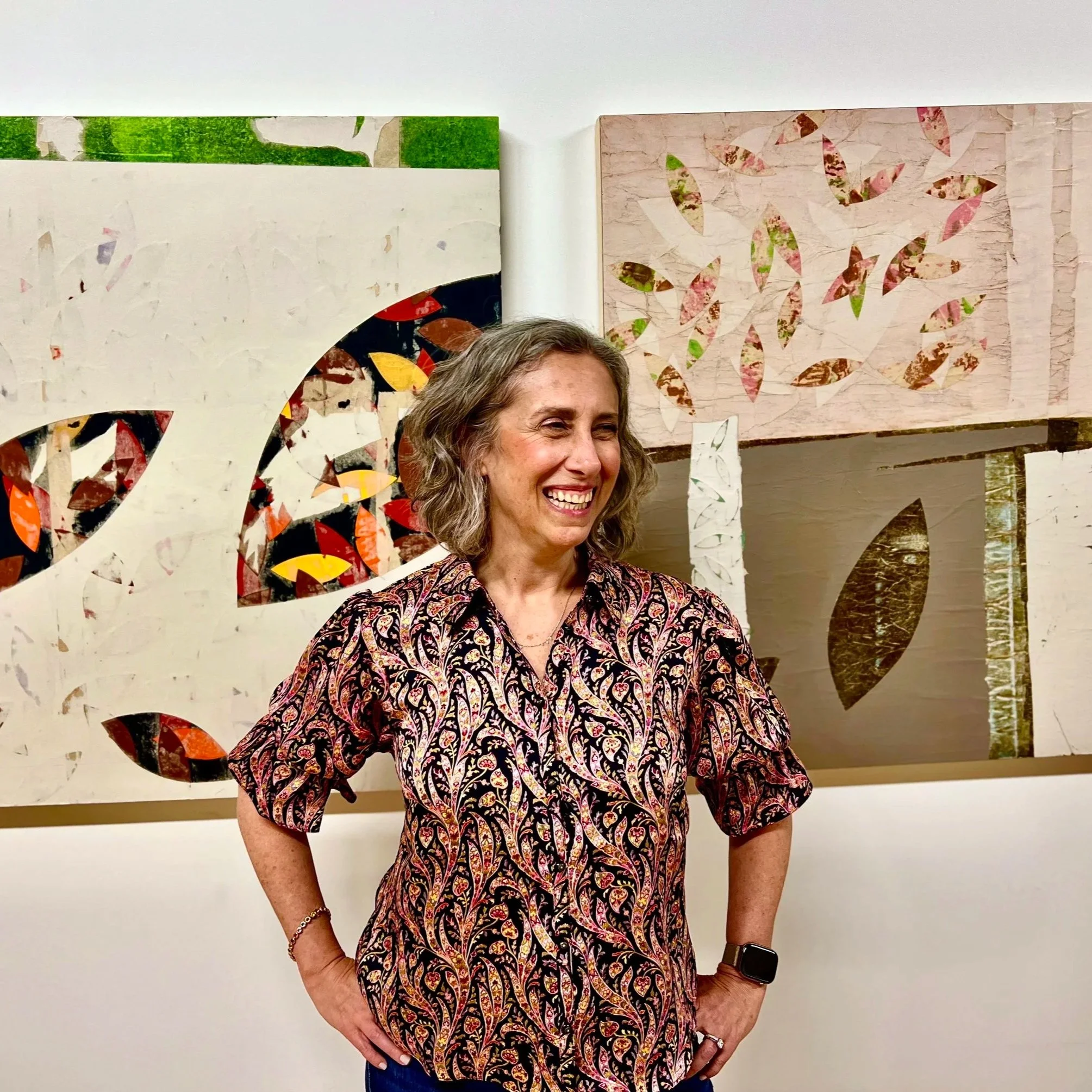 Dina is drawn to exploring the relationship between opposites—expressive brush stroke and hard edge, atmospheric background and shape, opacity and transparency, and the interplay of complementary colors in layering and mixing.